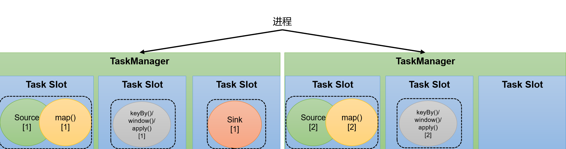 举例说明:假设一共有3个TaskManager,每一个TaskManager中的slot数量设置为3个,那么一共有9个task slot,表示集群最多能并行执行9个同一算子的子任务。