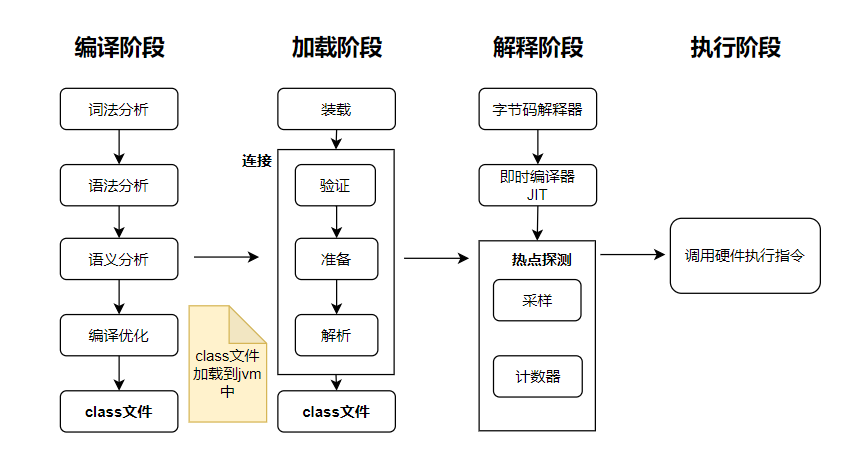 「解释阶段:把字节码转换为操作系统识别的指令」。