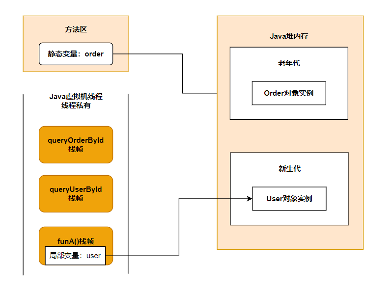 以上代码是一个很简答的示例,funA中有一个User对象,通过User对象调用了它的queryUserById方法。此时当前线程的虚拟机栈中就会有funA与queryUserById两个方法的栈帧。但是有个问题,new出来的User对象在哪里呢?