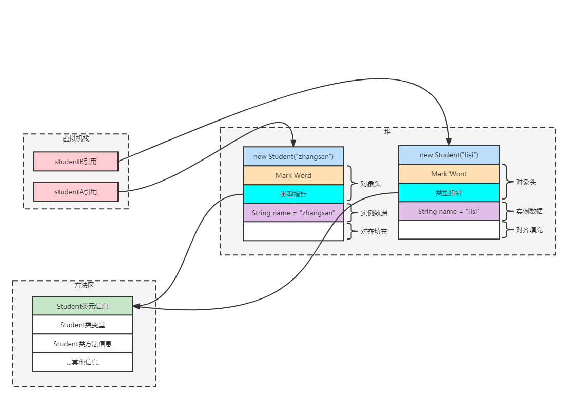 对象虽然放在堆内存中,但是它也不是随意乱放,我们都知道JVM是有GC的,为了高效的GC,堆内存是做了更细致的划分的,也就是常说的新生代,老年代,永久代,他们分别对应不同的GC,这部分我会在后续的文章中单独描述,这里就不展开了,反正首先知道对象实例是存放在堆中就可以了。