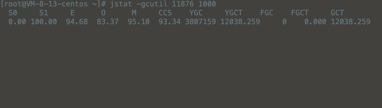 2、通过 jstat 命令的 gcutil 参数详细打印堆内存的信息,并每隔 1 秒打印一次