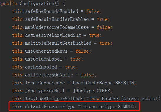 调用了openSessionFromDataSource 方法,并且第一个参数获取了默认的执行器类型,第二个参数为null,第三个参数为false,看看这个默认的执行器类型是啥