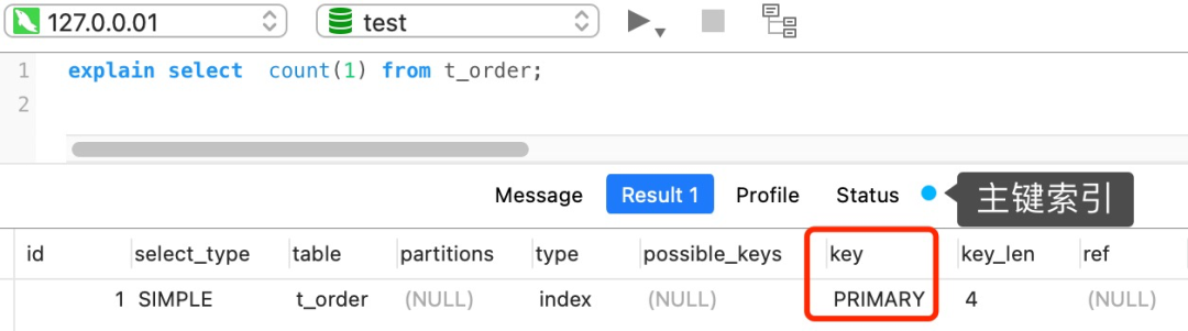 只有当没有二级索引的时候,才会采用主键索引来进行统计。