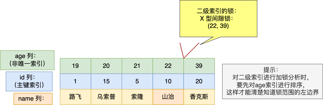 二级索引树是按照二级索引值(age列)按顺序存放的,在相同的二级索引值情况下, 再按主键 id 的顺序存放。知道了这个前提,我们才能知道执行插入语句的时候,插入的位置的下一条记录是谁。
