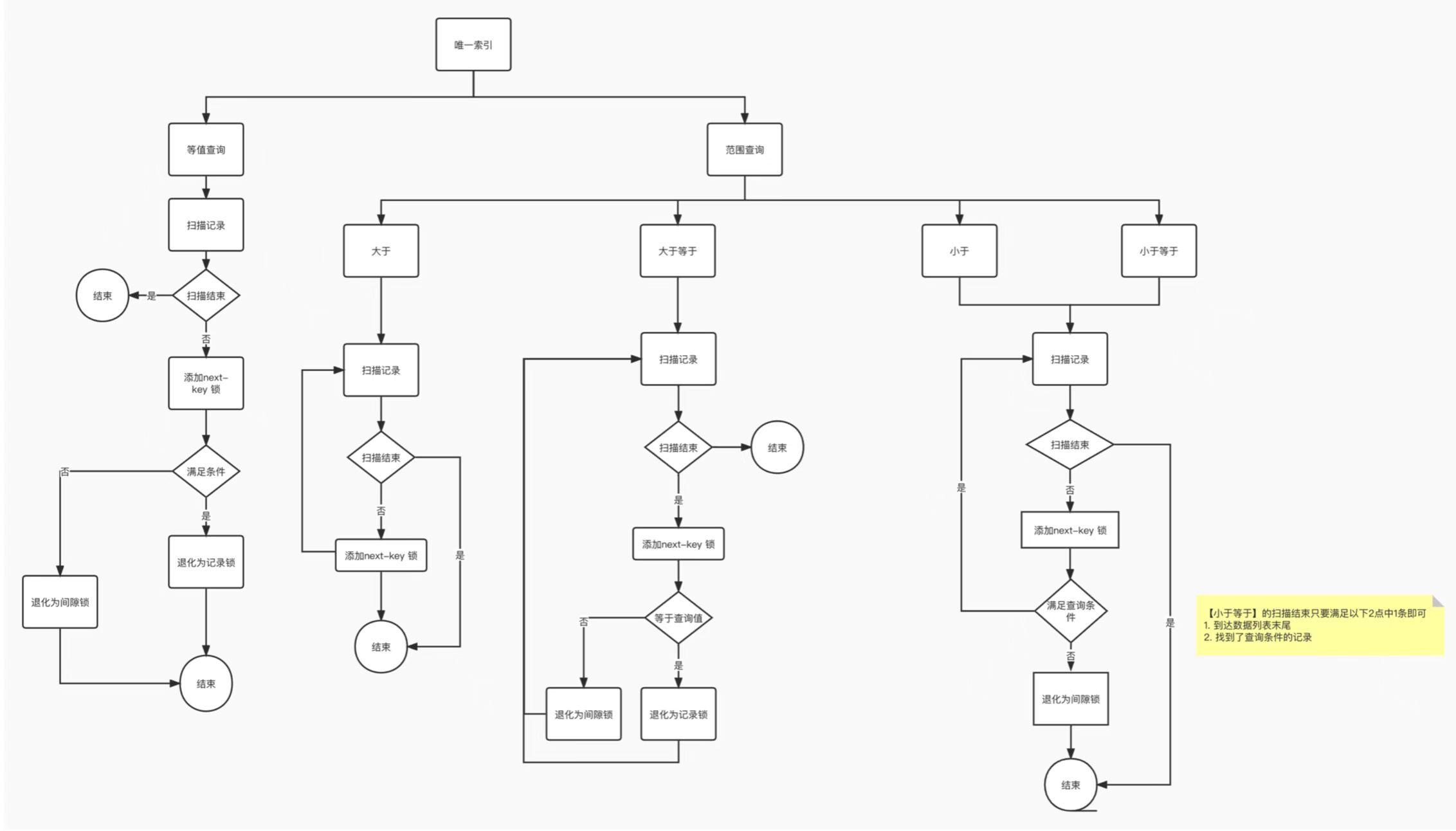 唯一索引(主键索引)加锁的流程图如下。(注意这个流程图是针对「主键索引」的,如果是二级索引的唯一索引,除了流程图中对二级索引的加锁规则之外,还会对查询到的记录的主键索引项加「记录锁」,流程图没有提示这一个点,所以在这里用文字补充说明下)