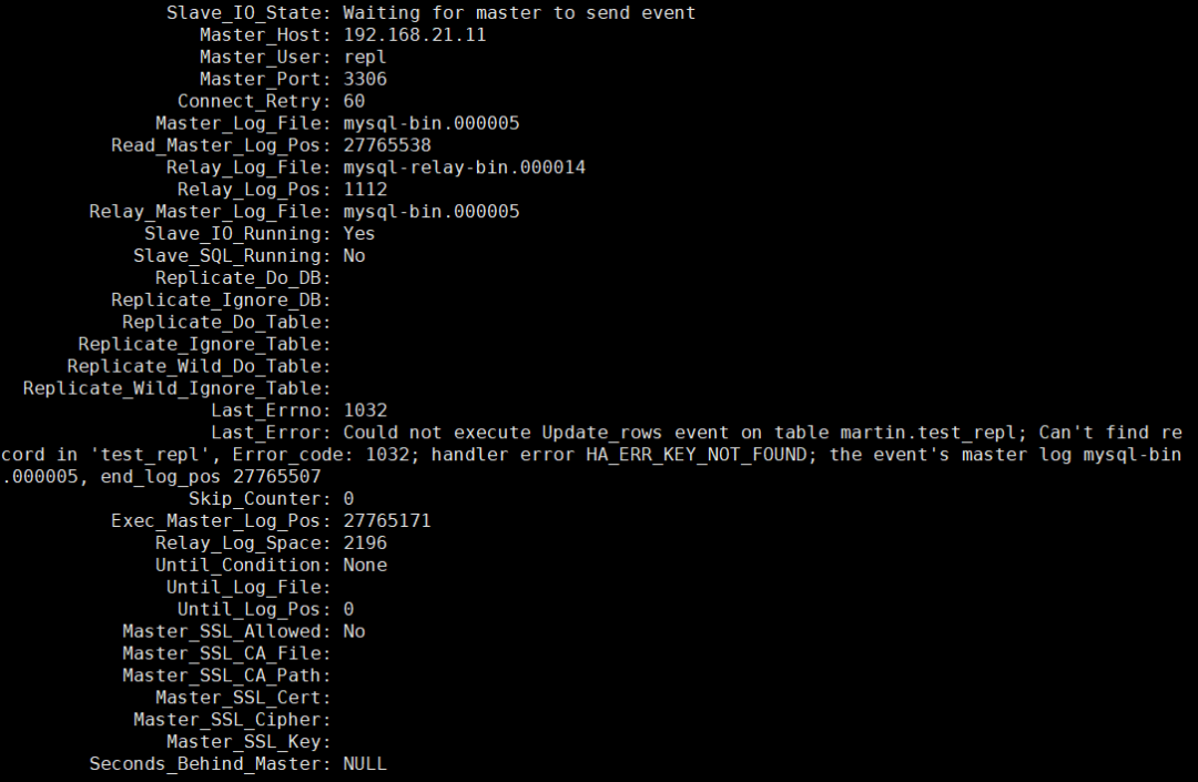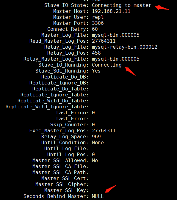Seconds_Behind_Master 显示为:NULL。
