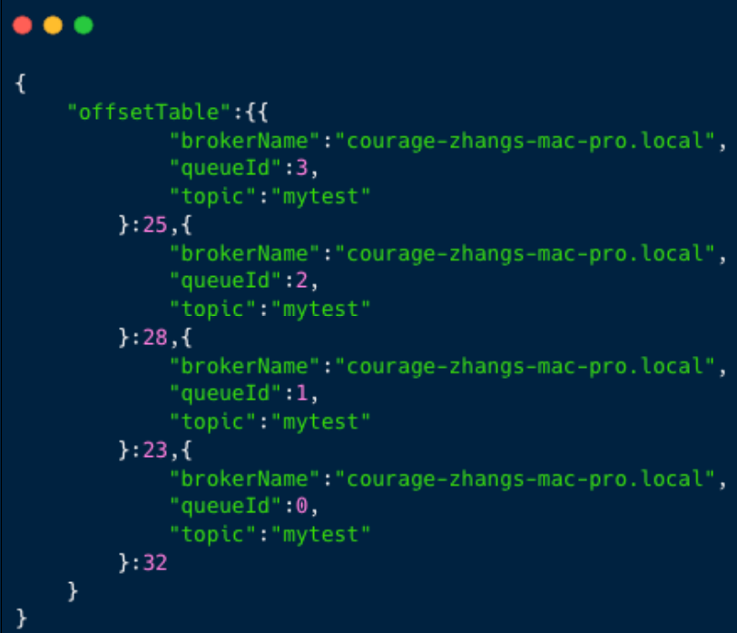 从上⾯代码我们可以看到消息模式为⼴播消费模式时,消费者会消费该主题下所有的队列,这⼀点也可以从本地的进度⽂件 offsets.json 得到印证。