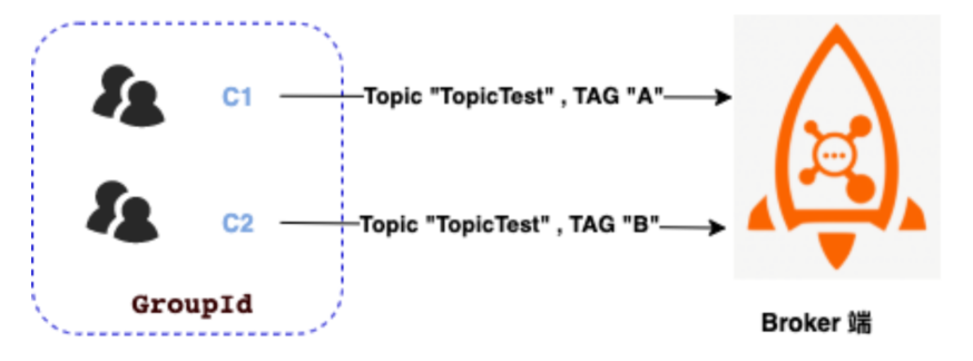 如图,C1 消费者和 C2 消费者订阅主题 TopicTest ,但两者的标签 TAG 并不相同。