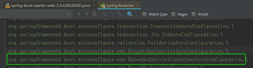 我们可以看到EmbeddedServletContainerAutoConfiguration被配置在spring.factories中, 看过我前面文章的朋友应该知道SpringBoot自动配置的原理,这里将EmbeddedServletContainerAutoConfiguration配置类加入到IOC容器中,接着我们来具体看看这个配置类: