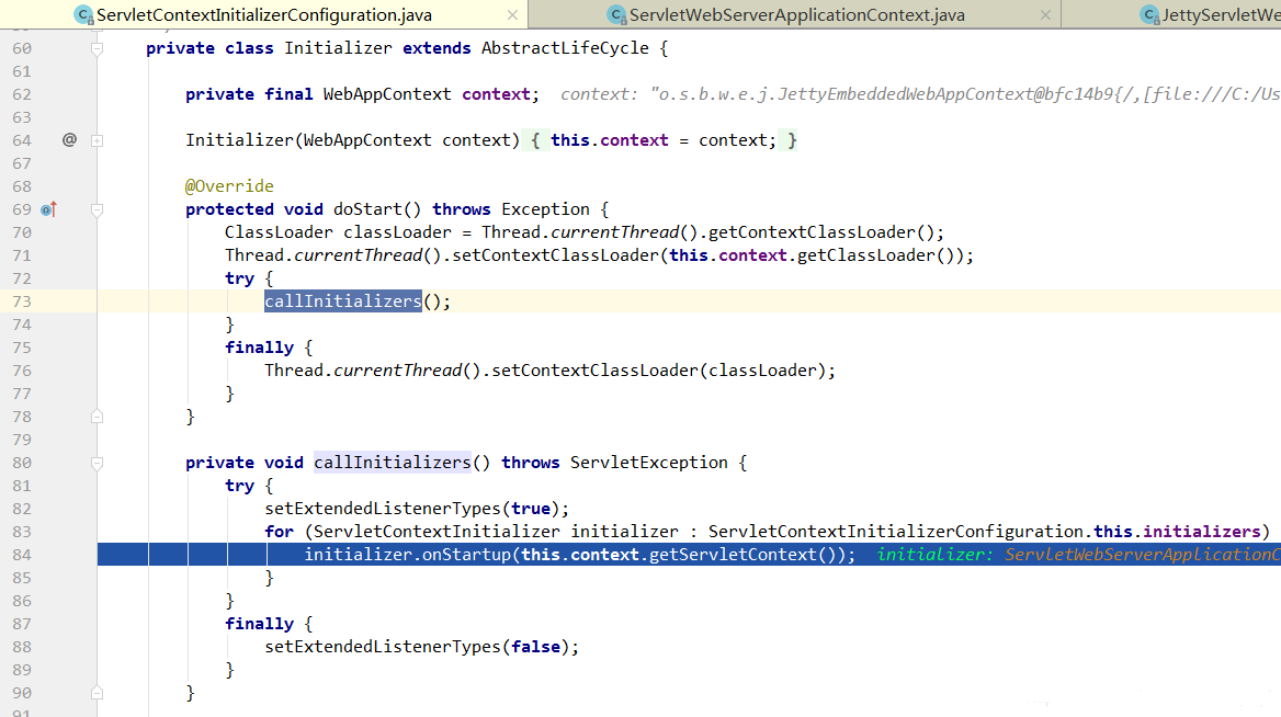 关键代码在第9和第11行,先获取所有的ServletContextInitializer 实现类,然后遍历执行所有ServletContextInitializer的onStartup方法