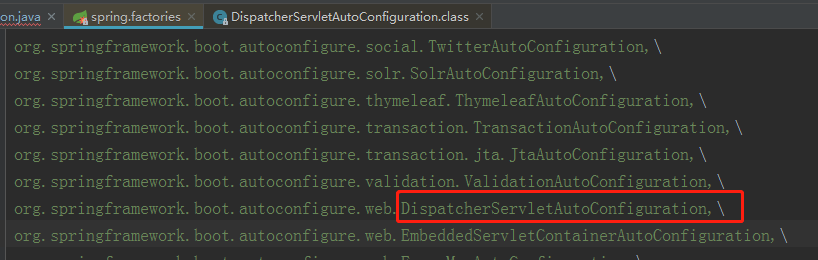 4. DispatcherServletAutoConfiguration 最熟悉的莫过于,在Spring Boot在自动配置SpringMVC的时候,会自动注册SpringMVC前端控制器:DispatcherServlet ,该控制器主要在DispatcherServletAutoConfiguration 自动配置类中进行注册的。DispatcherServlet是SpringMVC中的核心分发器。DispatcherServletAutoConfiguration也在spring.factories中配置了